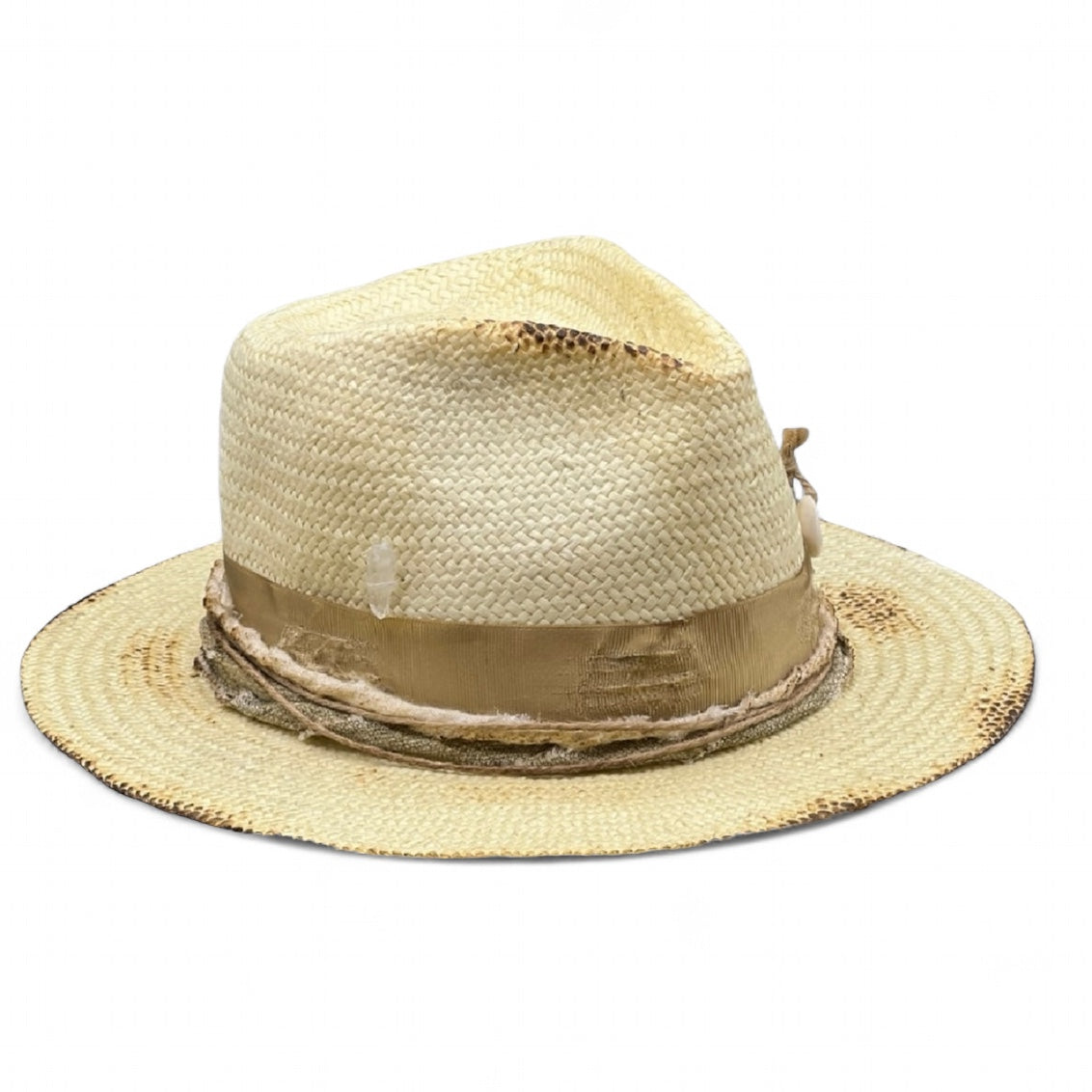 Each piece is adorned with a frayed grosgrain ribbon, rolled linen ties, golden beads, a safety pin, shell, and delicate feathers — details that make every hat truly unique.