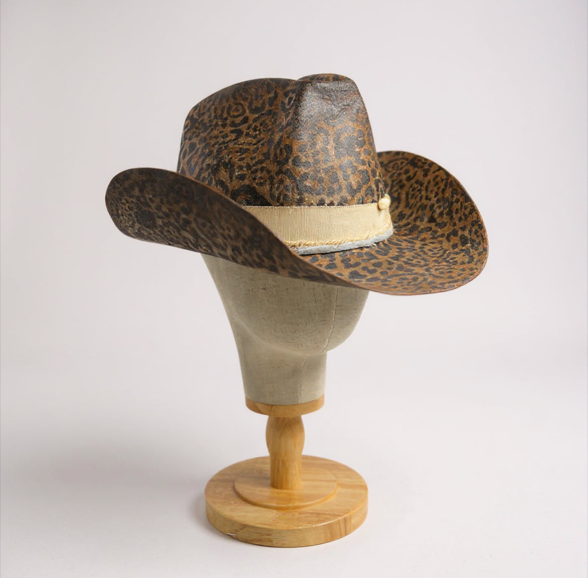 Make a statement with this handcrafted hat, featuring a striking animal print that adds a touch of wild elegance to any outfit. The bold cowboy-style crown (11 cm) and a generous brim (8–9 cm) create a timeless silhouette, while the delicate grosgrain ribbon and esparto detailing bring artisanal charm and sophistication.