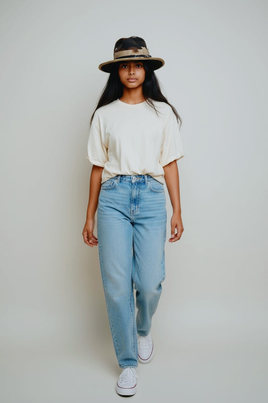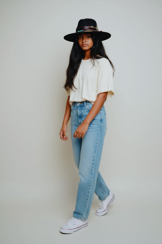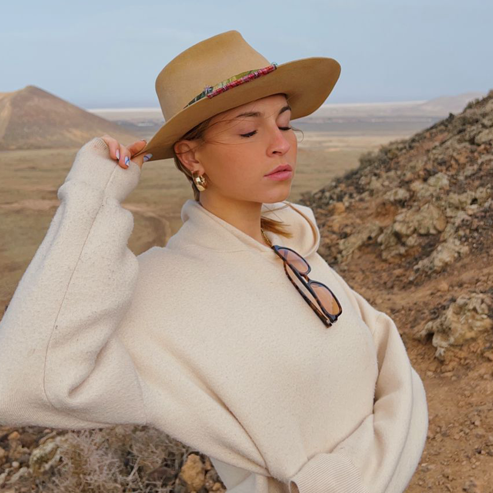 Cada detalle refleja una búsqueda por unir elegancia y libertad, con un toque boho que se expresa de forma natural en su ala amplia y su carácter único.