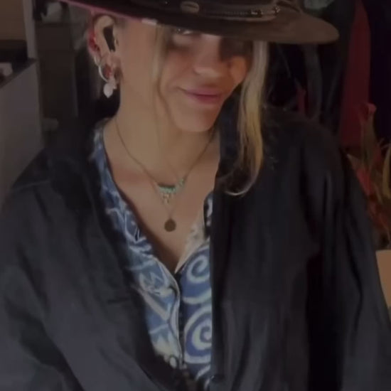 Step into a world of mystical charm with our 100% distressed black felt hat, handcrafted in Barcelona. Each hat tells a story, blending vintage bohemian style with artisanal detailing for a truly unique statement piece.
