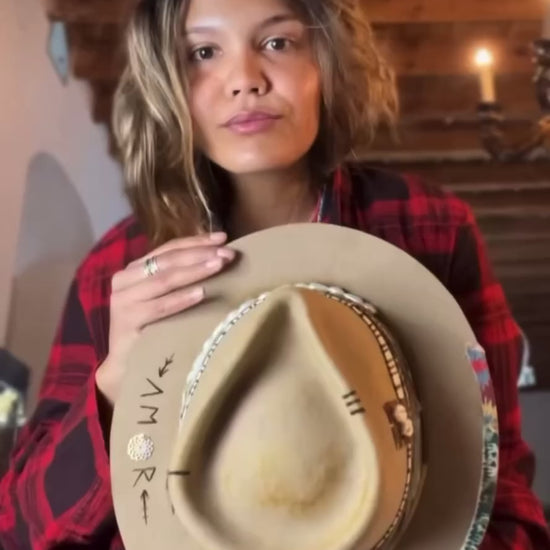 Elevate your style with the All You Need Is Amor hat, a handmade artisan felt fedora crafted in Barcelona. Made from 100% premium camel felt, it features an 11 cm (4.3”) crown and a 7.5 cm (2.95”) wide brim, offering a perfect blend of elegance and boho-inspired charm.