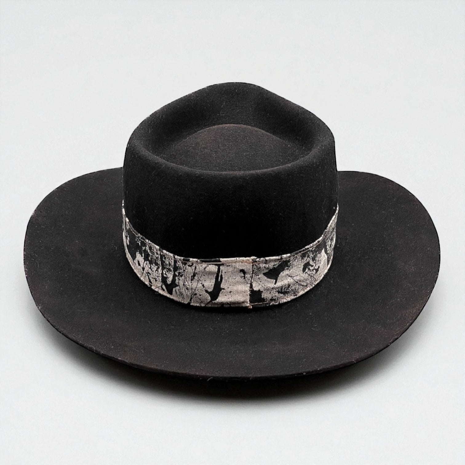 The hat includes a black hand-painted ribbon over a black base, creating a tonal, artistic detail that adds depth without overwhelming the design. Its burned, worn-in finish gives it character, texture, and a handcrafted feel—each piece subtly unique. Every hat is handmade in Barcelona, crafted with care and precision from premium-quality felt.