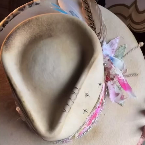 Decorated with rolled esparto, linen, and silk ribbons in various tones and prints, it features a silver bead necklace, half animal print trim, quartz stones, metallic thread embroidery with arrow motifs, and multiple feathers of different sizes and textures. The interior lining ensures a comfortable fit and adds to the hat’s artisan quality.