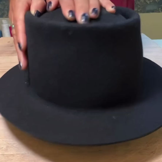 A unique handcrafted piece that blends tradition, artistry, and character. Made from premium black wool felt, this hat features an 10 cm (4.3 in) crown and an 5 cm brim, enhanced with exclusive details: an ethnic print ribbon, a leatherette band, Lignum vitae wood, pheasant feather accents, and refined pyrography work. Each surface has been carefully sanded and burned for a smooth, elegant finish.