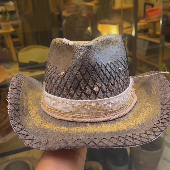 Step into bold style and attitude with Tribal Soul, a 100% merino wool felt hat finished with a leather-effect in brown and gold tones. Featuring an 11 cm crown and an 8 cm cowboy brim, this hat combines dramatic design, artisanal craftsmanship, and a statement-making silhouette.