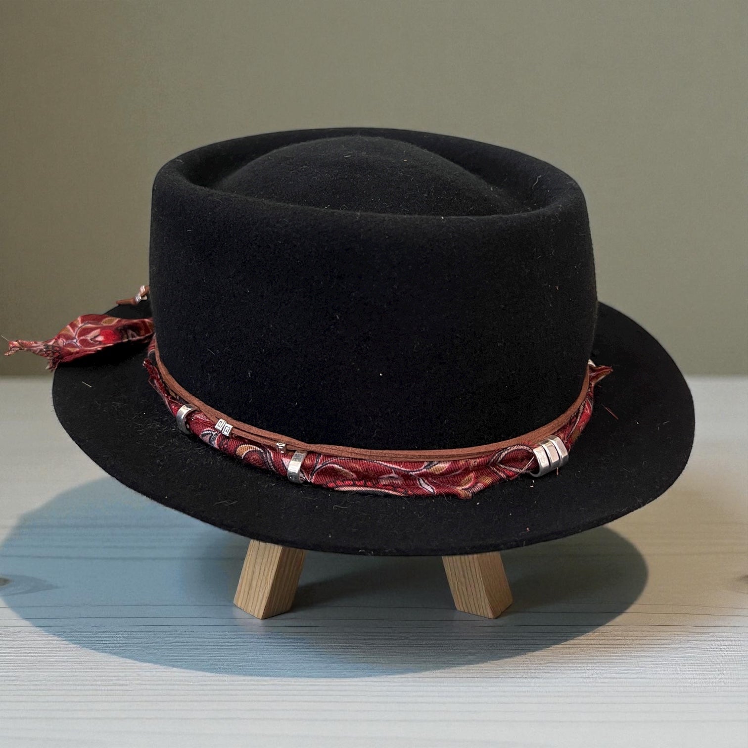 A unique handcrafted piece that blends tradition, artistry, and character. Made from premium black wool felt, this hat features an 10 cm (4.3 in) crown and an 5 cm brim, enhanced with exclusive details. Each surface has been carefully sanded and burned for a smooth, elegant finish.