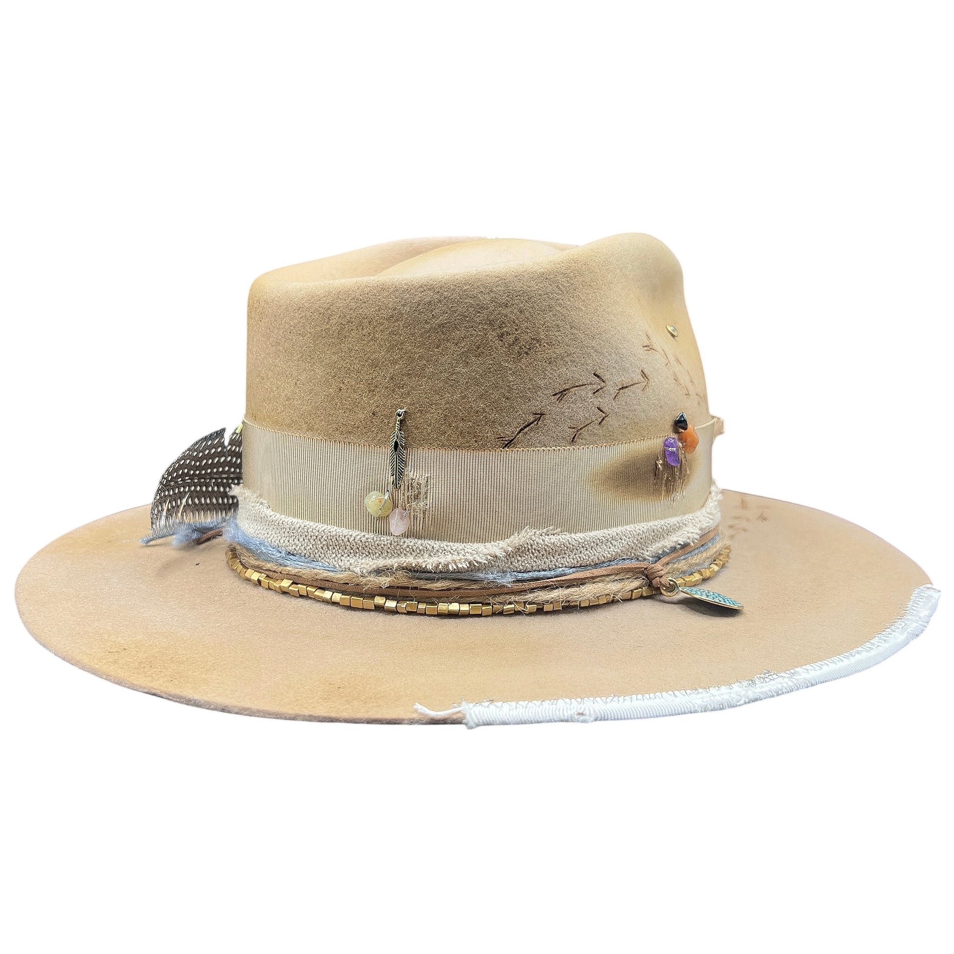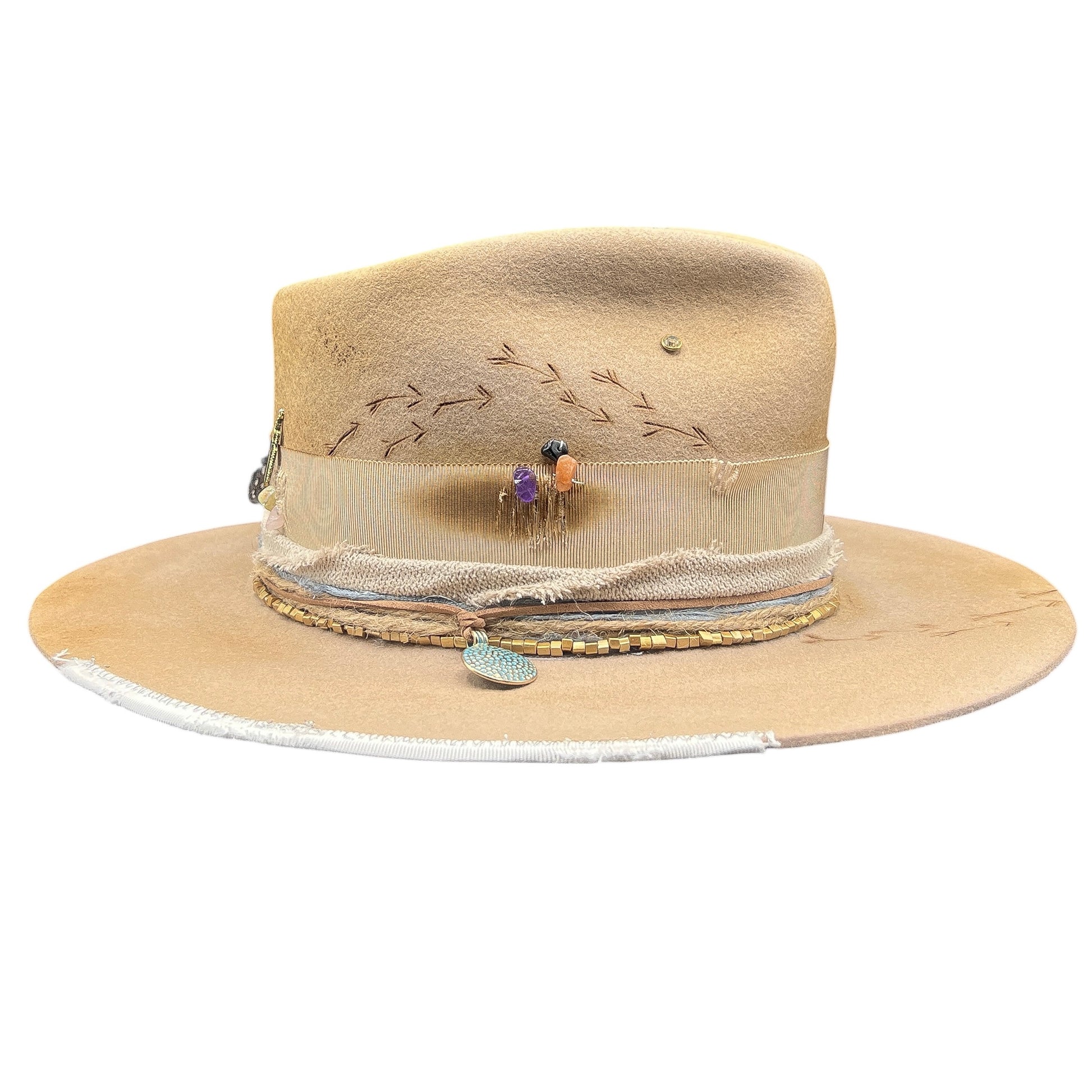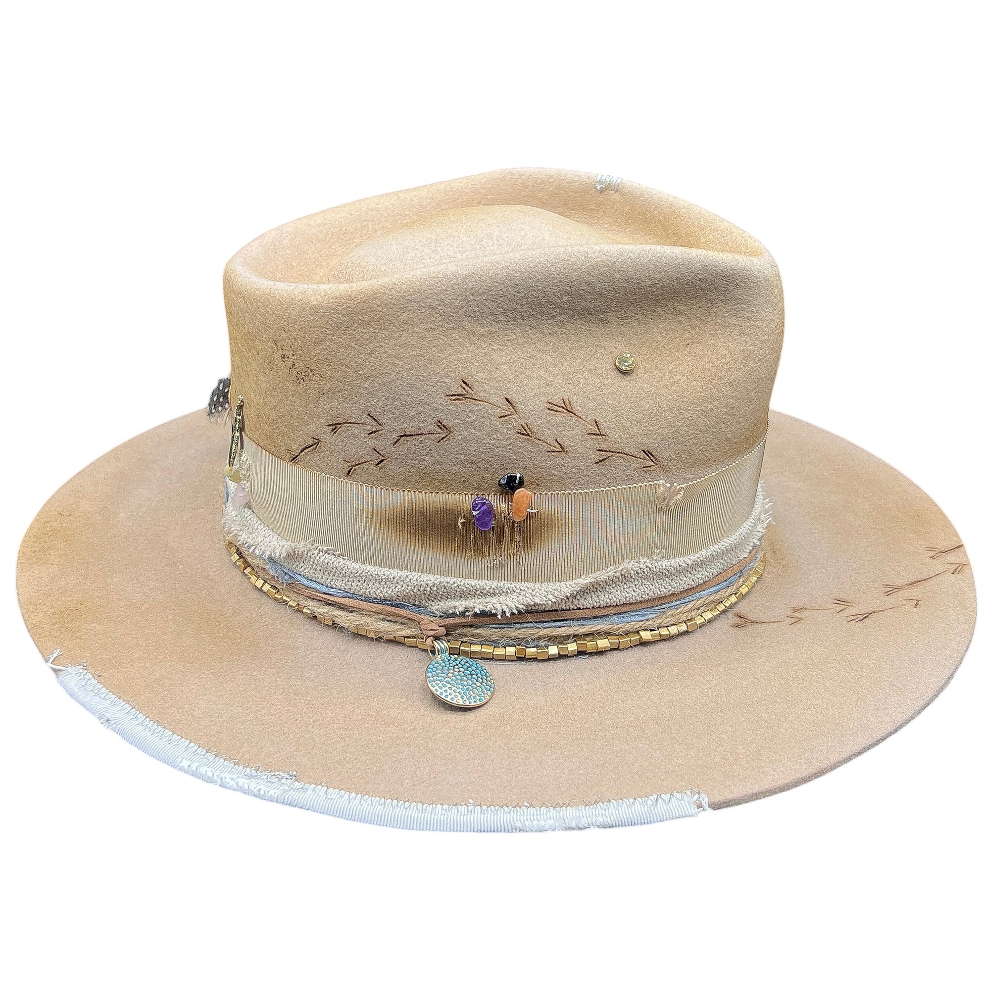Featuring a vintage 100% cotton grosgrain band, delicate cotton and silk ribbons, esparto and suede cords, and a golden beaded collar, this hat brings a unique handcrafted charm to every outfit.