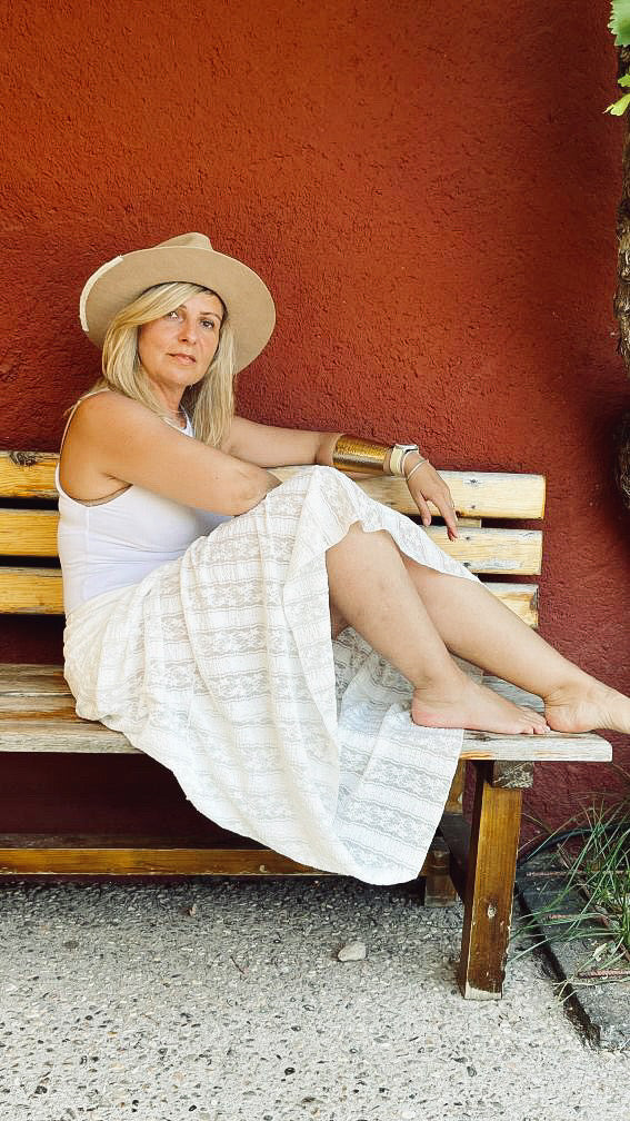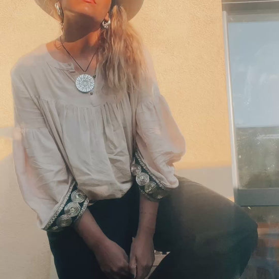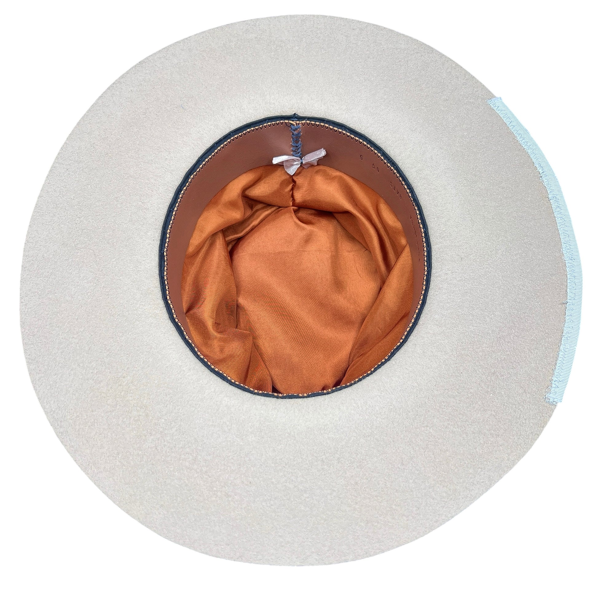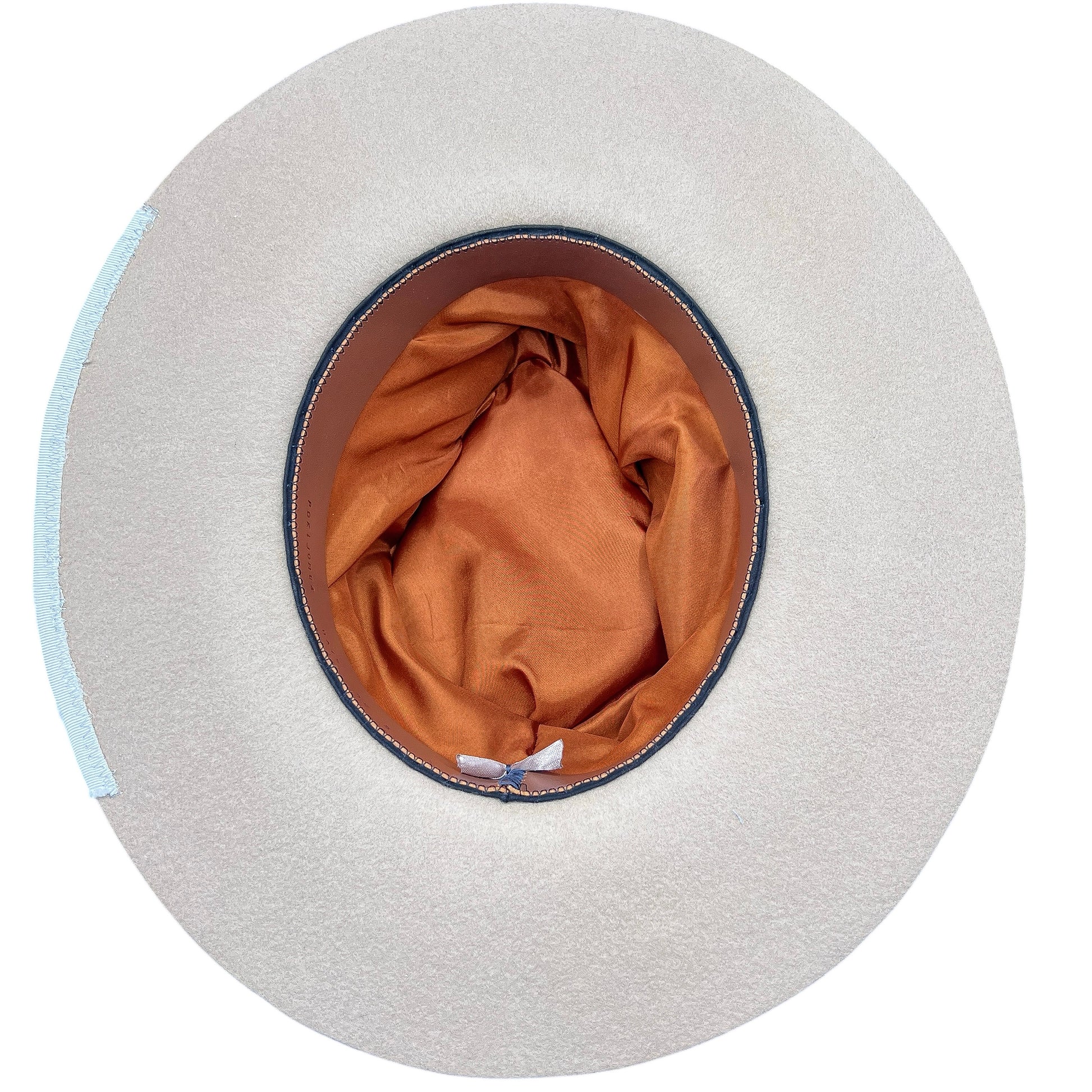 Featuring a vintage 100% cotton grosgrain band, delicate cotton and silk ribbons, esparto and suede cords, and a golden beaded collar, this hat brings a unique handcrafted charm to every outfit.
