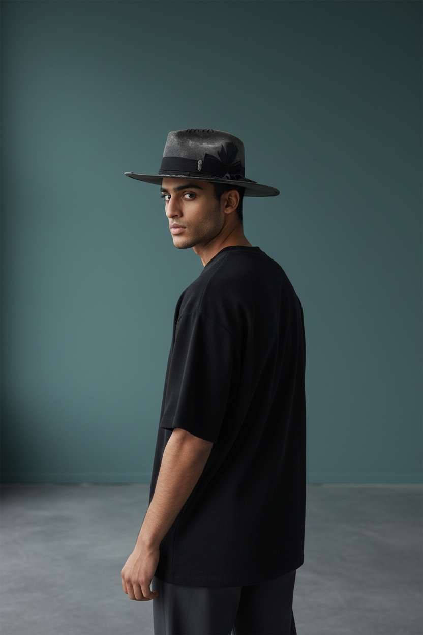This striking black hat is handcrafted from 100% hand-dyed tie-dye felt, creating a unique one-of-a-kind piece with a bold, artisanal character. The crown measures 12 cm (4.72 inches) in a classic round shape, and the brim measures 7.5 cm (2.95 inches), offering a perfectly balanced silhouette.