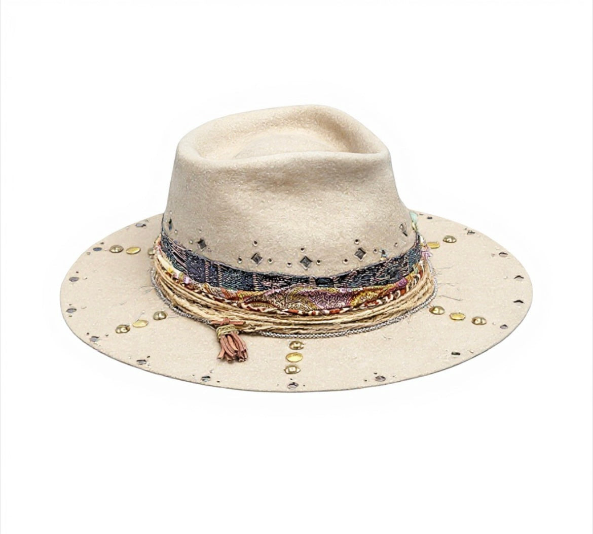 Elevate your style with this handmade 100% felt hat in classic Beige, crafted at Pokijomba Hats Studio in Barcelona. Featuring a 10 cm crown and 7 cm brim, this artisan fedora combines boho-chic details with vintage-inspired accents, creating a unique, statement-making accessory.
