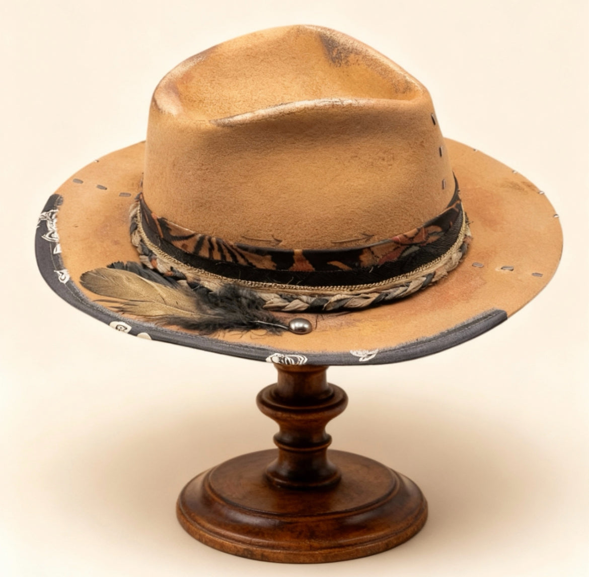 Decorative elements elevate this hat into a true wearable artwork: