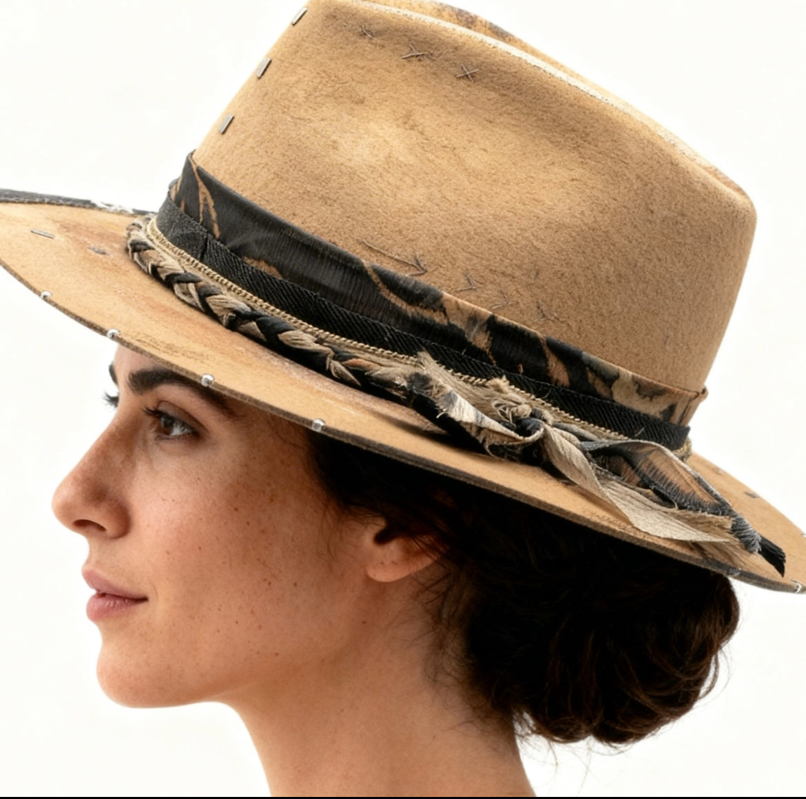 a black ribbon printed in warm brown tones, layered with a golden silk ribbon, organza braid, and mixed textile trims. Details such as esparto cord, half-printed edging, and a bundle of natural feathers on the brim add texture, movement, and a refined bohemian feel.