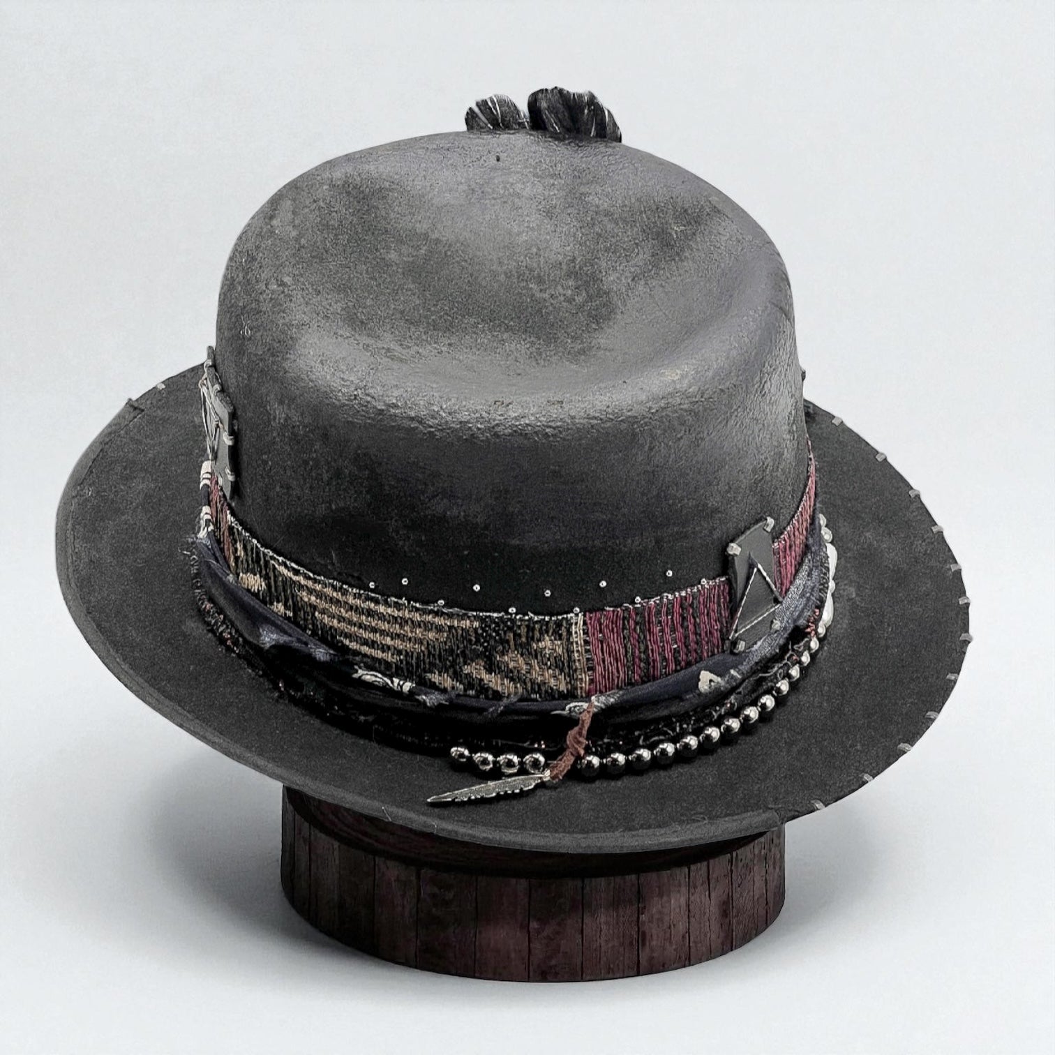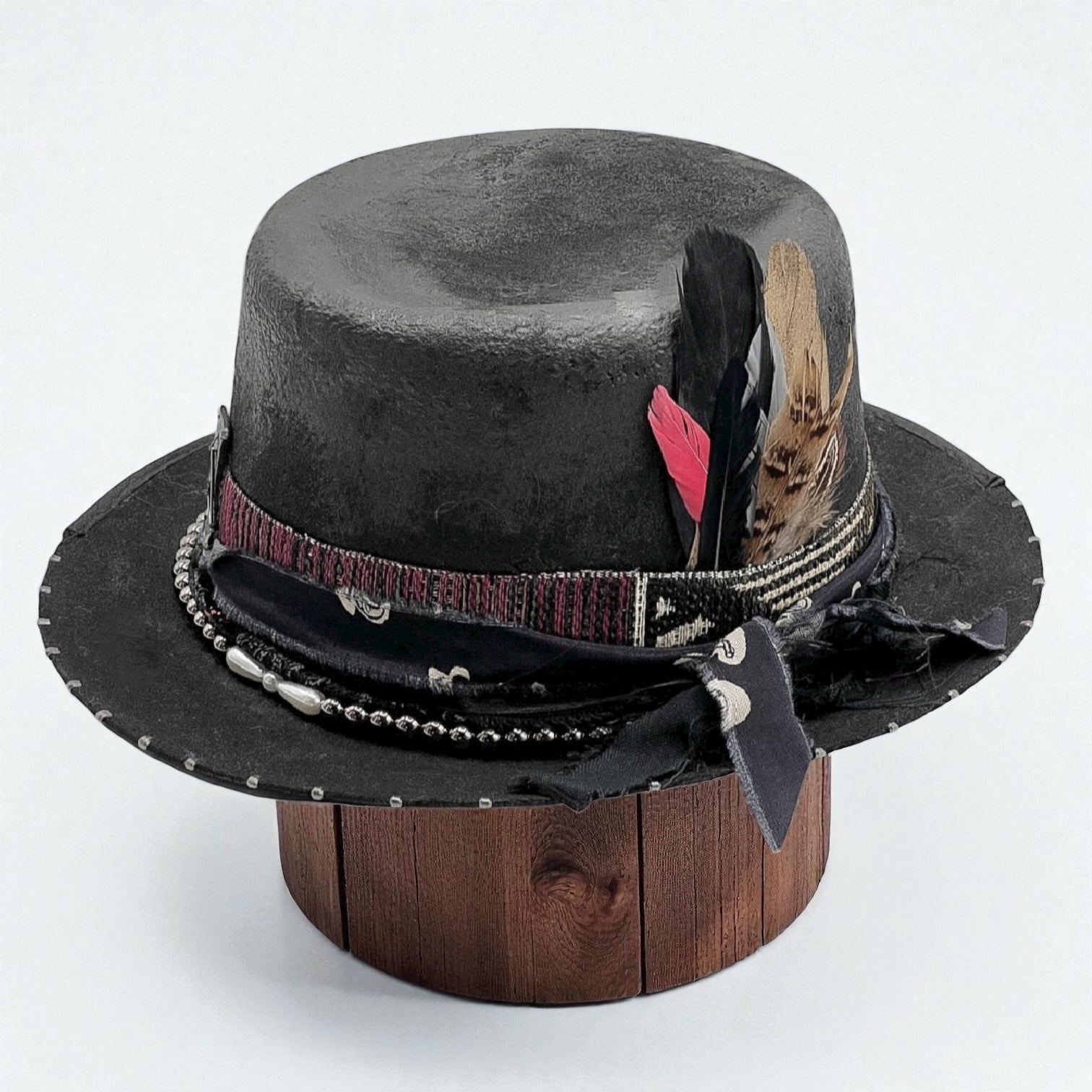 This unique design combines an ethnic print ribbon, a black and white printed silk band, an organza ribbon, and a shiny black fabric ribbon. It is decorated with a metallic bead necklace, small silver rivets on the crown, leather patches with triangle charms, and carefully arranged feathers. Staples along the brim and a half-trim detail complete its artistic, handcrafted look.