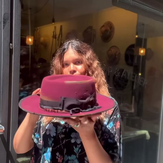 Elevate your style with Chloe, a 100% Australian wool felt hat in a rich burgundy hue. Featuring an 11 cm crown and an 8 cm / 3.14 in brim, this round-crown hat blends classic elegance with artisanal detailing, making it a timeless statement piece.