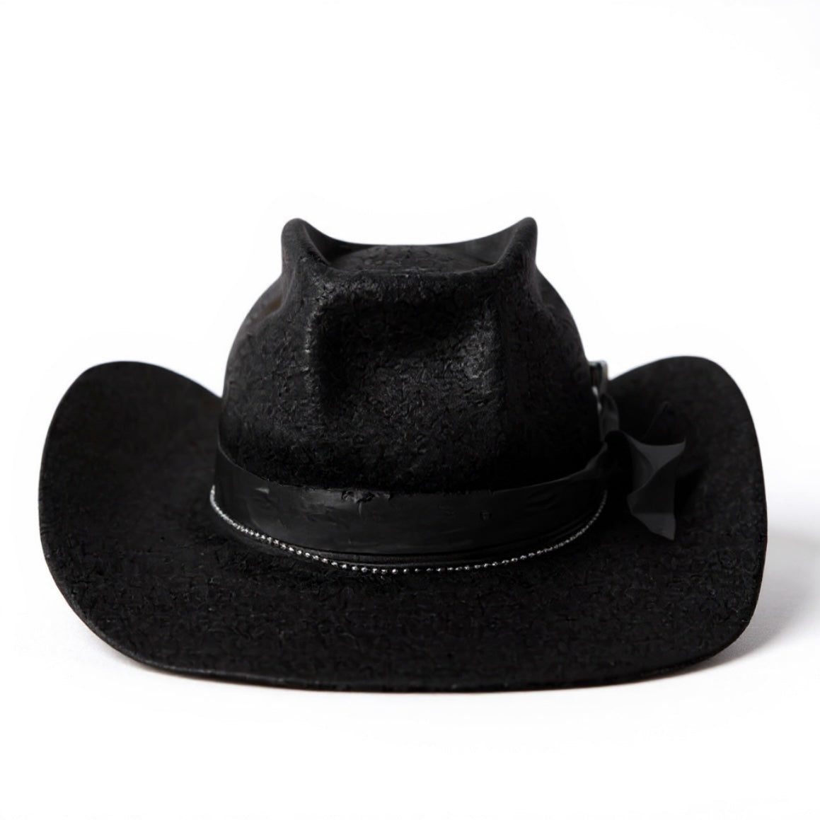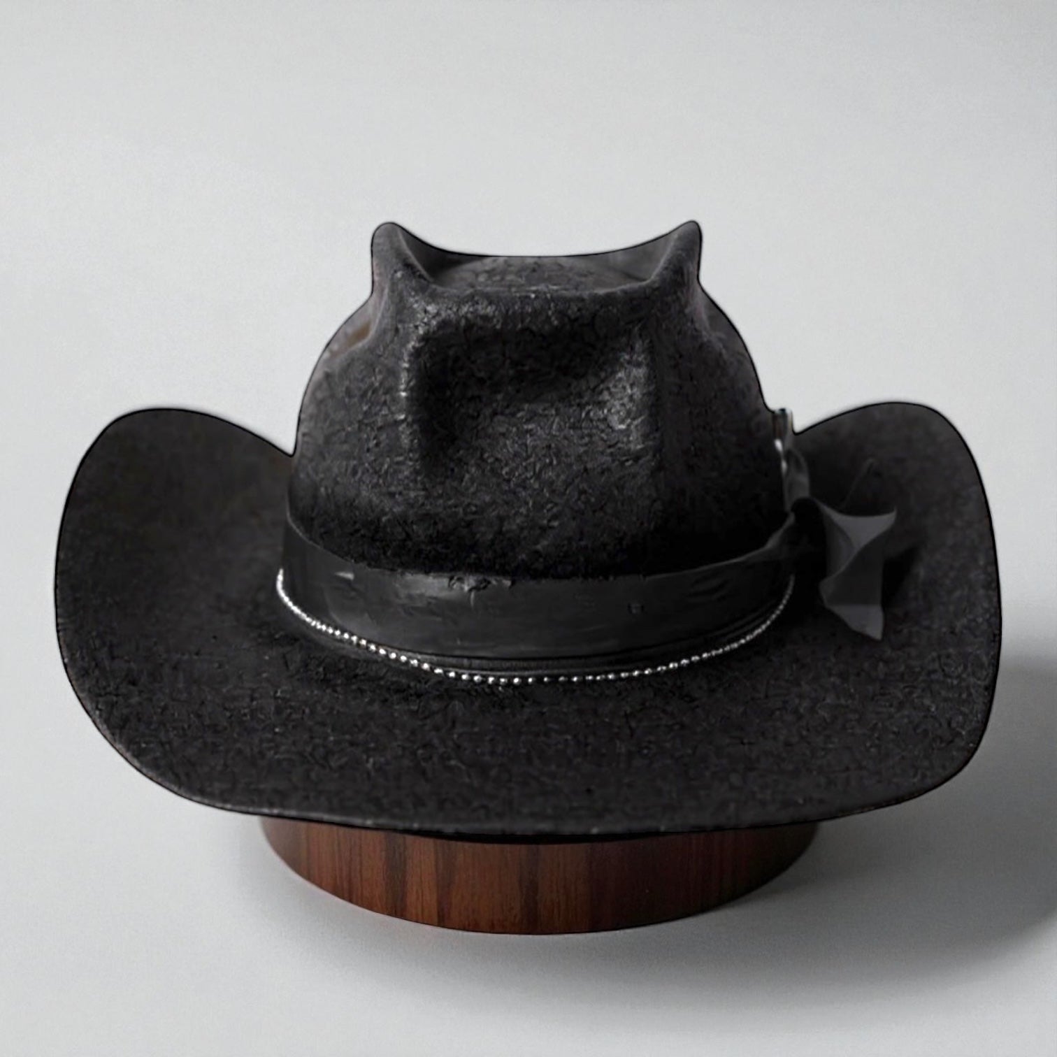 A timeless statement piece handcrafted with the finest Australian wool felt. This black hat features an 11 cm crown and a wide 10 cm brim, creating a bold and elegant silhouette. Finished with a matching black ribbon, it embodies sophistication in its purest form.
