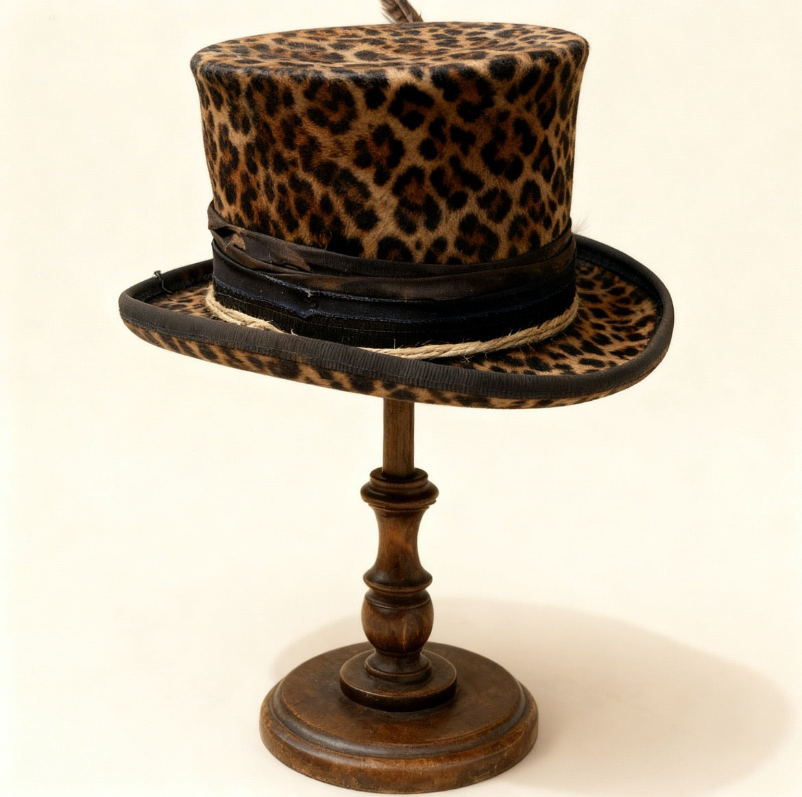 Step into adventure and timeless style with this worn black top hat, handcrafted in Barcelona with a carefully distressed, vintage-aged finish. Designed for those who love bold, whimsical fashion, this top hat combines classic elegance with a rugged, storybook charm.