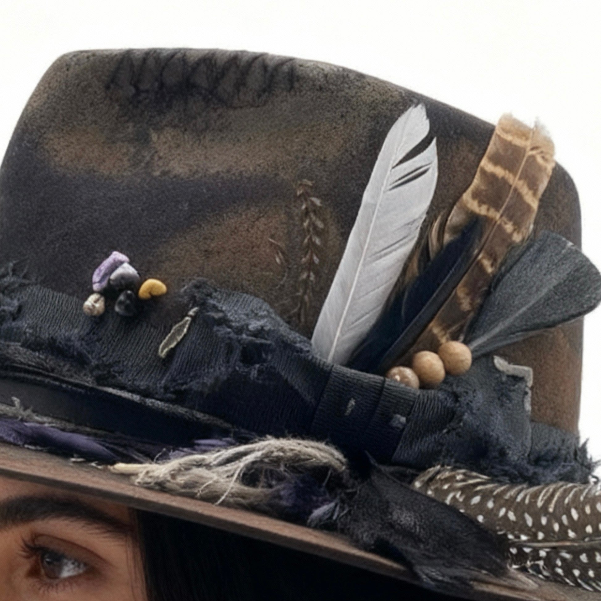- Hand-sewn mineral stones and ornamental fire engravings on both crown and brim.
