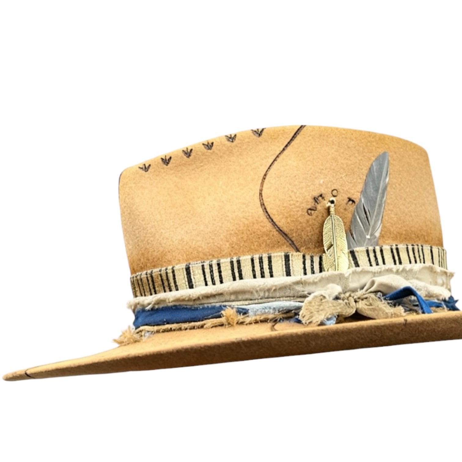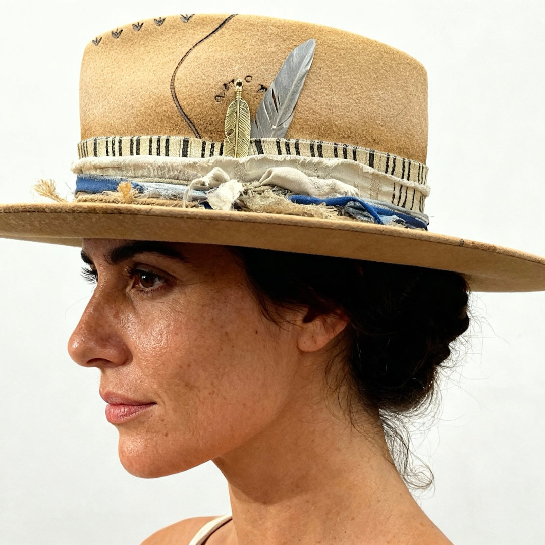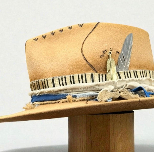 Sombrero 100% fieltro en Camel desgastado con estampado hecho a mano de lineas curvas