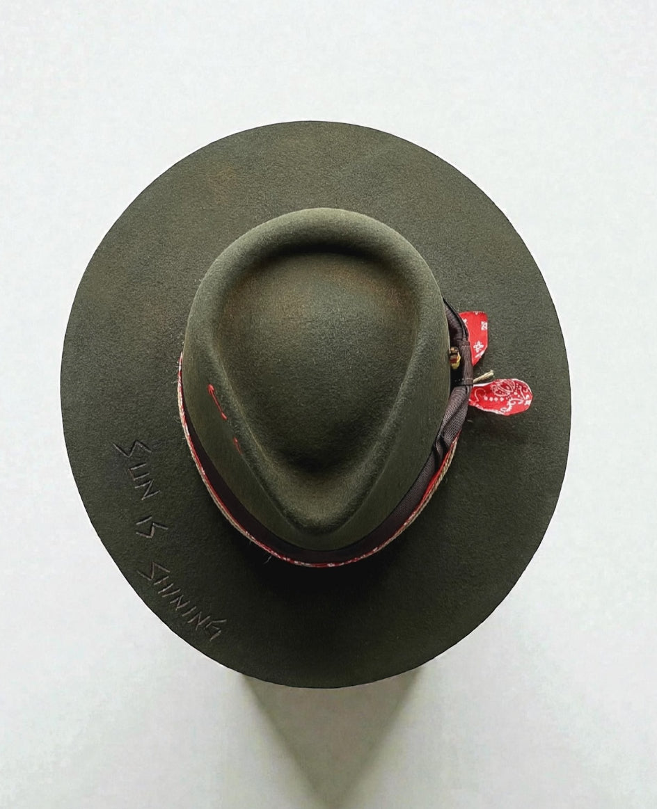 A unique feature of this hat is the use of lignum vitae wood, carefully decorated through pyrography, then hand sanded and burned to achieve a smooth, natural finish. Each hat is made individually, ensuring that no two pieces are exactly alike.