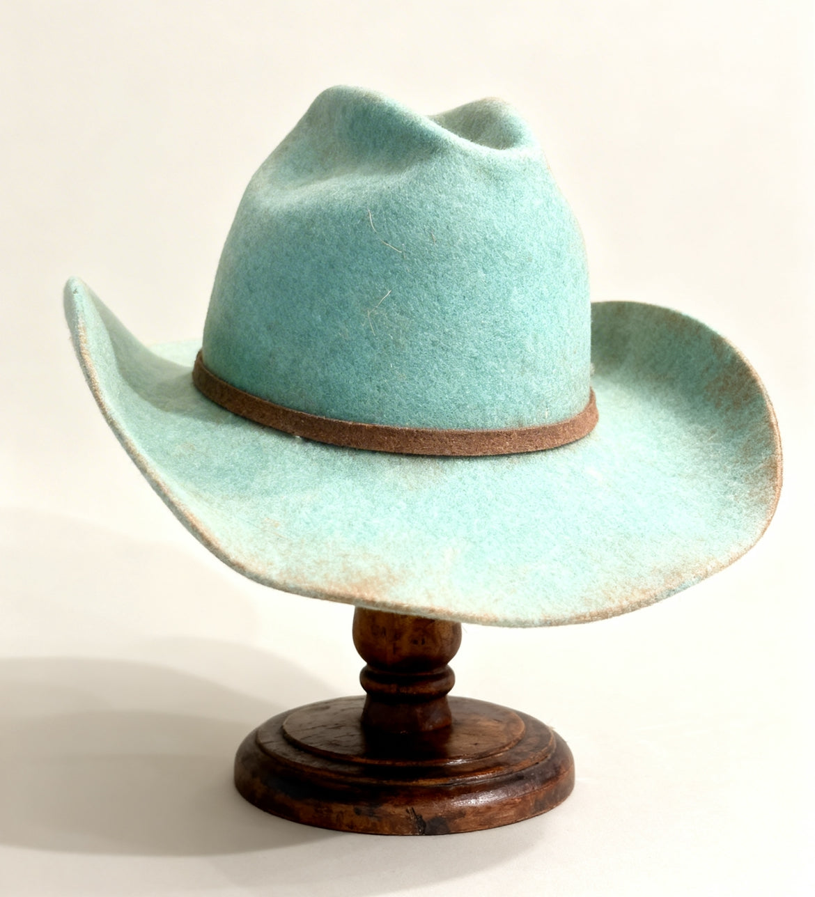 • Turquoise felt cowboy hat with golden shimmer gradient for a bold, luminous look